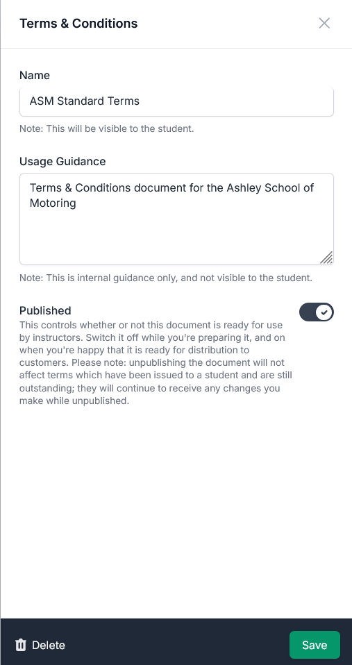 By way of an introduction, Terms and Conditions are provided to clarify what you expect from your students and what they can expect from you. Furthermore, it protects both you and your learners in the unlikely case that there is future disagreement about whether the instructor or student has failed to deliver what was expected of them. As such, you should consider a Terms and Conditions document an absolute necessity for your business and not an optional extra and because it is an essential part of your business, we provide the ability to create, edit and issue documents via the web app.