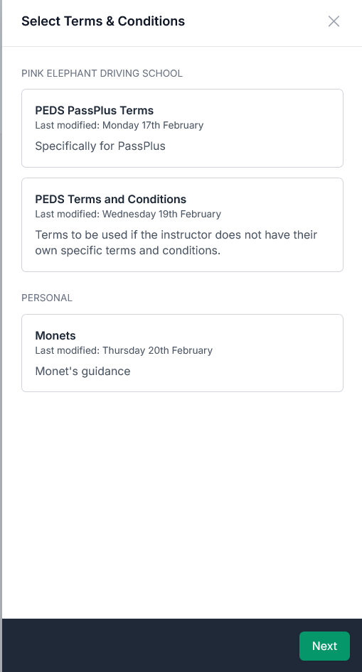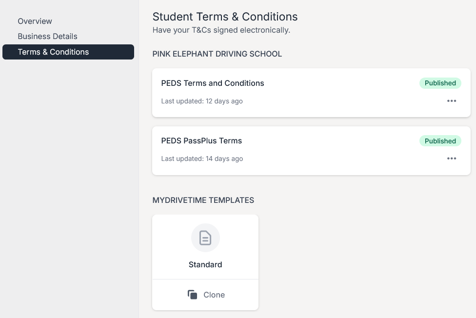 When you access the Student Terms & Conditions feature, you will be presented with a list of all the team terms plus the ability to clone a standard set, provided by MyDriveTime, and add a completely blank set if you wish via the ‘+’ button.