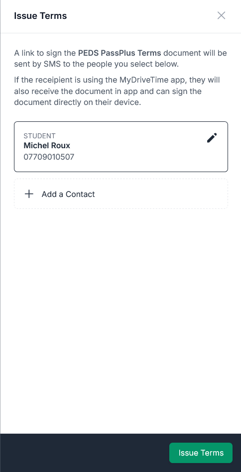 Select the intended recipient and click ‘Issue Terms’. The student will receive notification in the student app, if they have it, that there are terms to be reviewed and signed as well as an SMS with a link to the terms document, which they can use to sign if required.