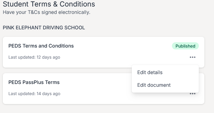 Although the ability to set up terms and conditions has been available for some time on the web, this release provides the ability to issue terms to students on the web and improves the editing process including the ability to publish terms documents. For details of these changes and how to maintain and issue terms, please see https://www.mydrivetime.co.uk/blog/release-2-9-0/.